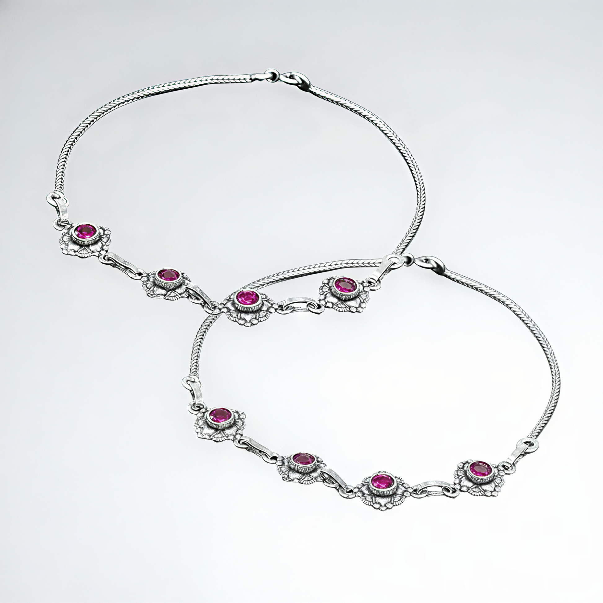 Featuring vivid ruby-pink stones delicately set in intricate floral motifs, these anklets exude feminine charm and heritage artistry. The classic oxidized silver detailing enhances their vintage appeal, making them perfect for festive occasions, ethnic outfits, or everyday sophistication.