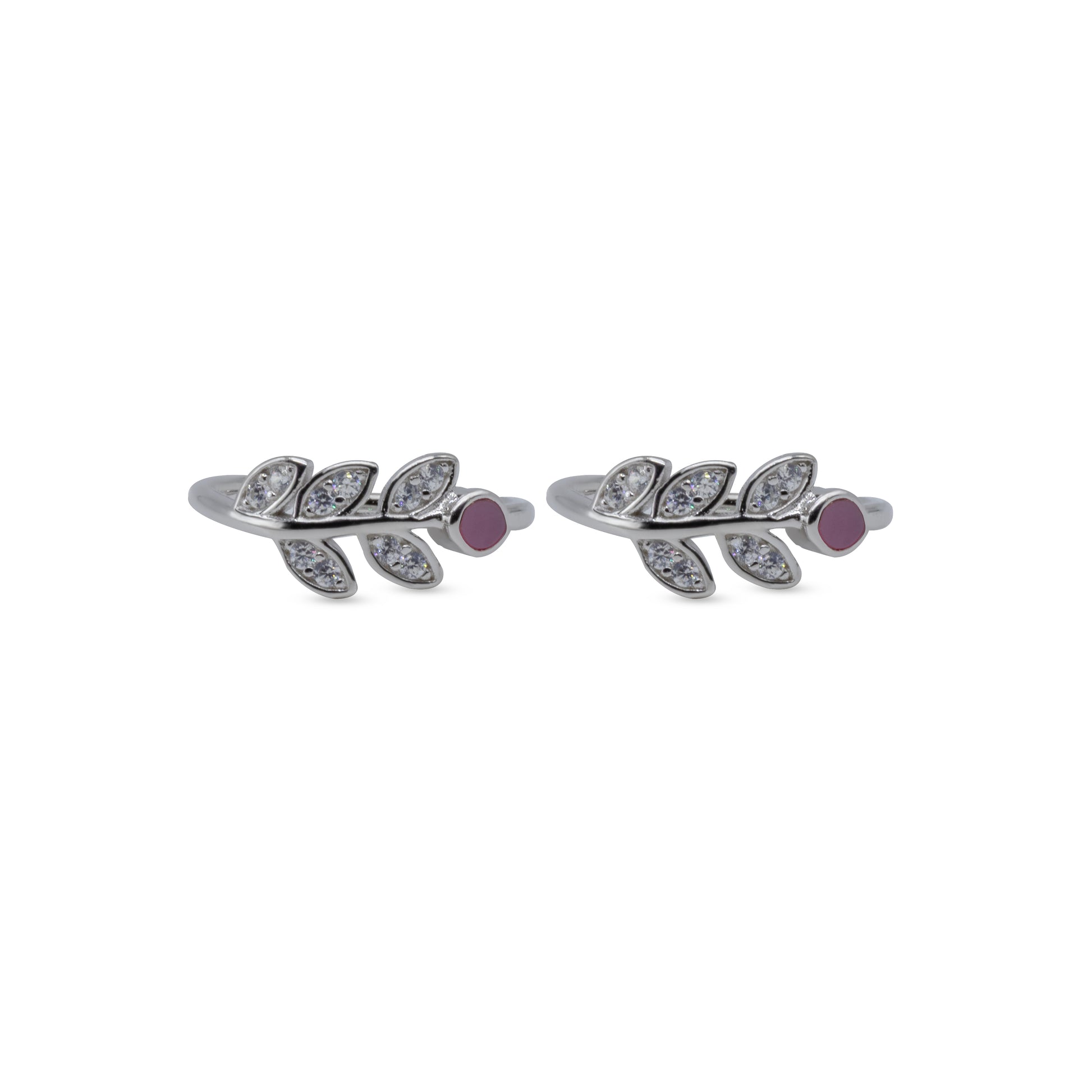 Inspired by nature’s delicate beauty, this Blush Leaf Vine Toe Ring is crafted from 925 Sterling Silver and enhanced with a radiant rhodium finish for long-lasting brilliance. The elegant vine design features CZ-studded leaves that sparkle with every movement, complemented by soft pink enamel buds on either end for a feminine touch.