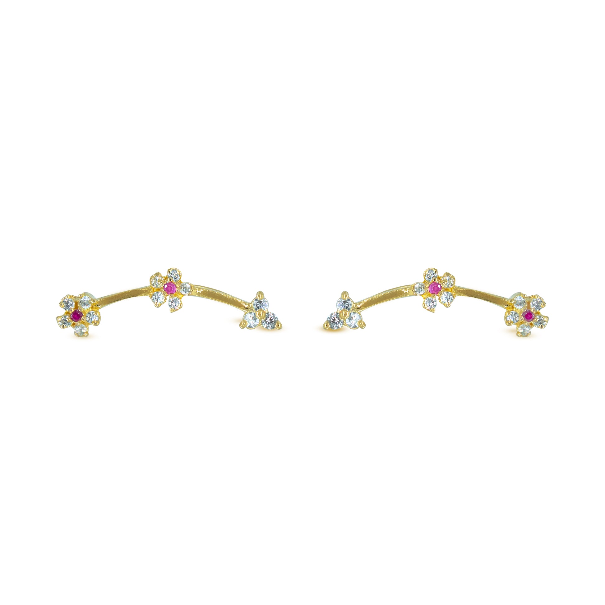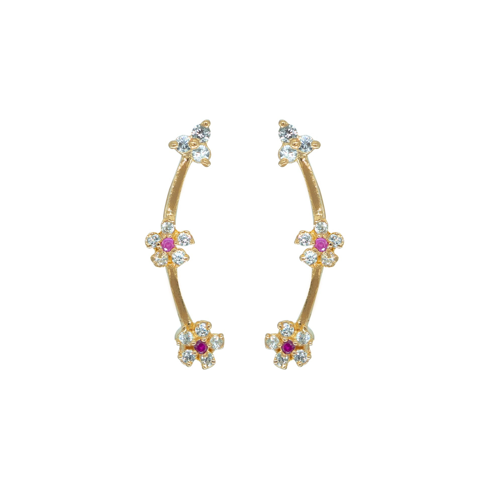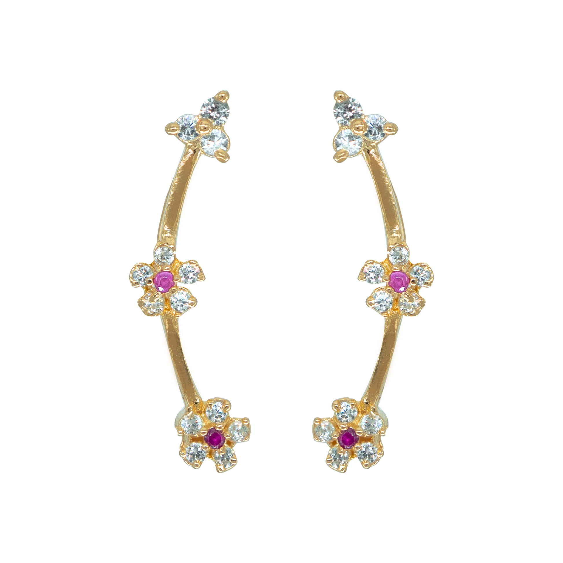 Grace your ears with timeless sparkle and feminine charm with this CZ Floral Bloom Ear Cuff, also known as a Bluetooth earring for its modern, curved design. Handcrafted in 925 sterling silver and coated with luxurious gold plating, this elegant piece features a series of delicate floral motifs adorned with white and pink cubic zirconia stones.
