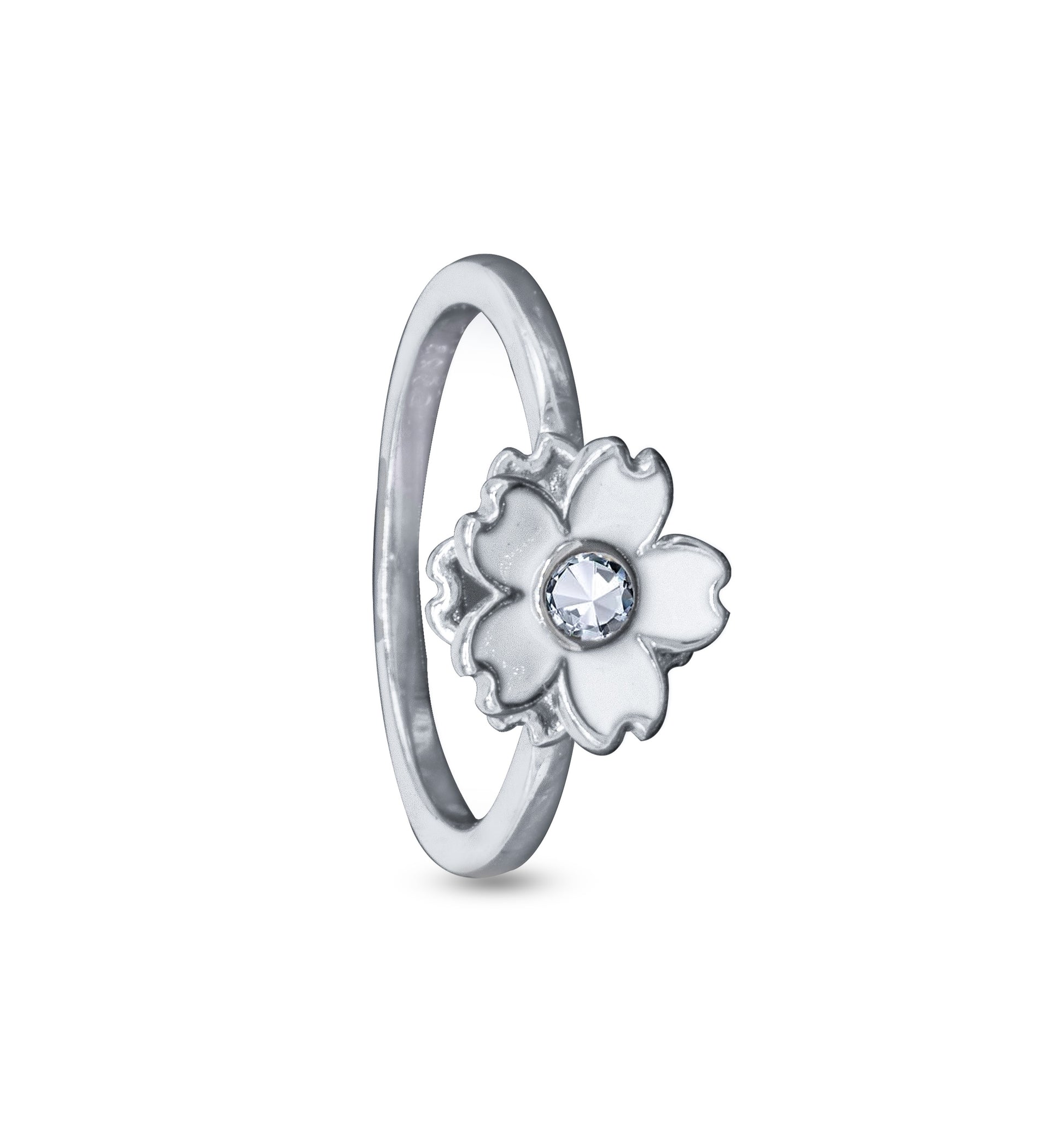 Delicate and timeless, the White Blossom Ring captures the beauty of simplicity in full bloom. Crafted in 925 Sterling Silver and finished with a radiant rhodium polish, it features a graceful white enamel flower centered with a sparkling Cubic Zirconia stone for a soft, sophisticated glow