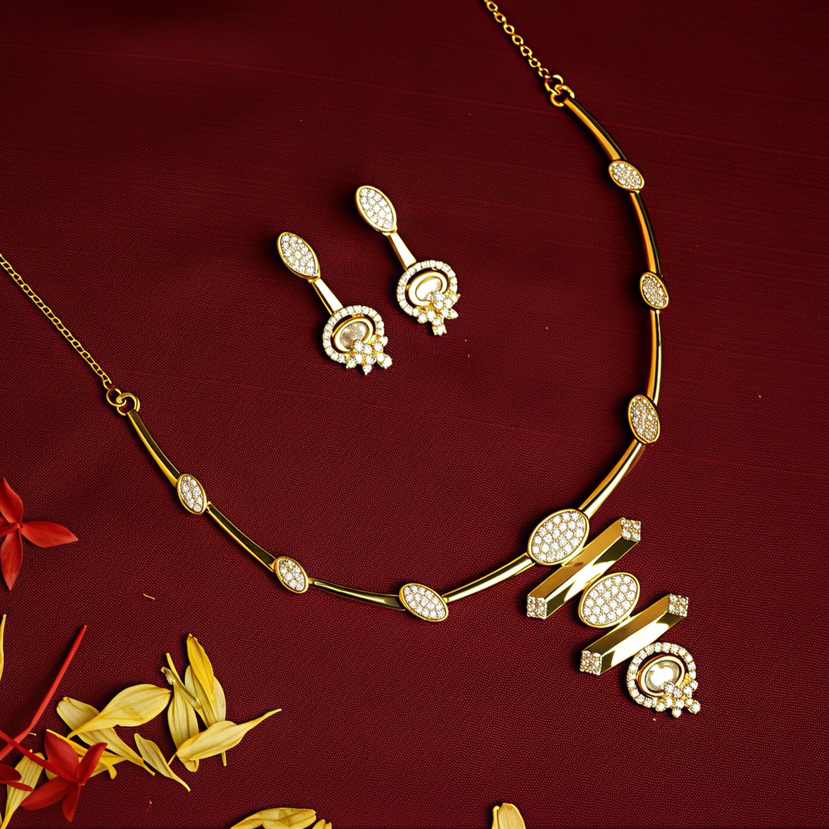 Gold necklace and earrings on a red background with decorative leaves.925 Silver Gold-Plated Modern CZ Designer Necklace Set for Women | Party & Festive Wear Jewellery925 Silver Gold-Plated Modern CZ Designer Necklace Set for Women | Party & Festive Wear Jewellery925 Silver Gold-Plated Modern CZ Designer Necklace Set for Women | Party & Festive Wear Jewellery925 Silver Gold-Plated Modern CZ Designer Necklace Set for Women | Party & Festive Wear JewelleryGreen jewelry box with 'Tavshan' branding on a beige background