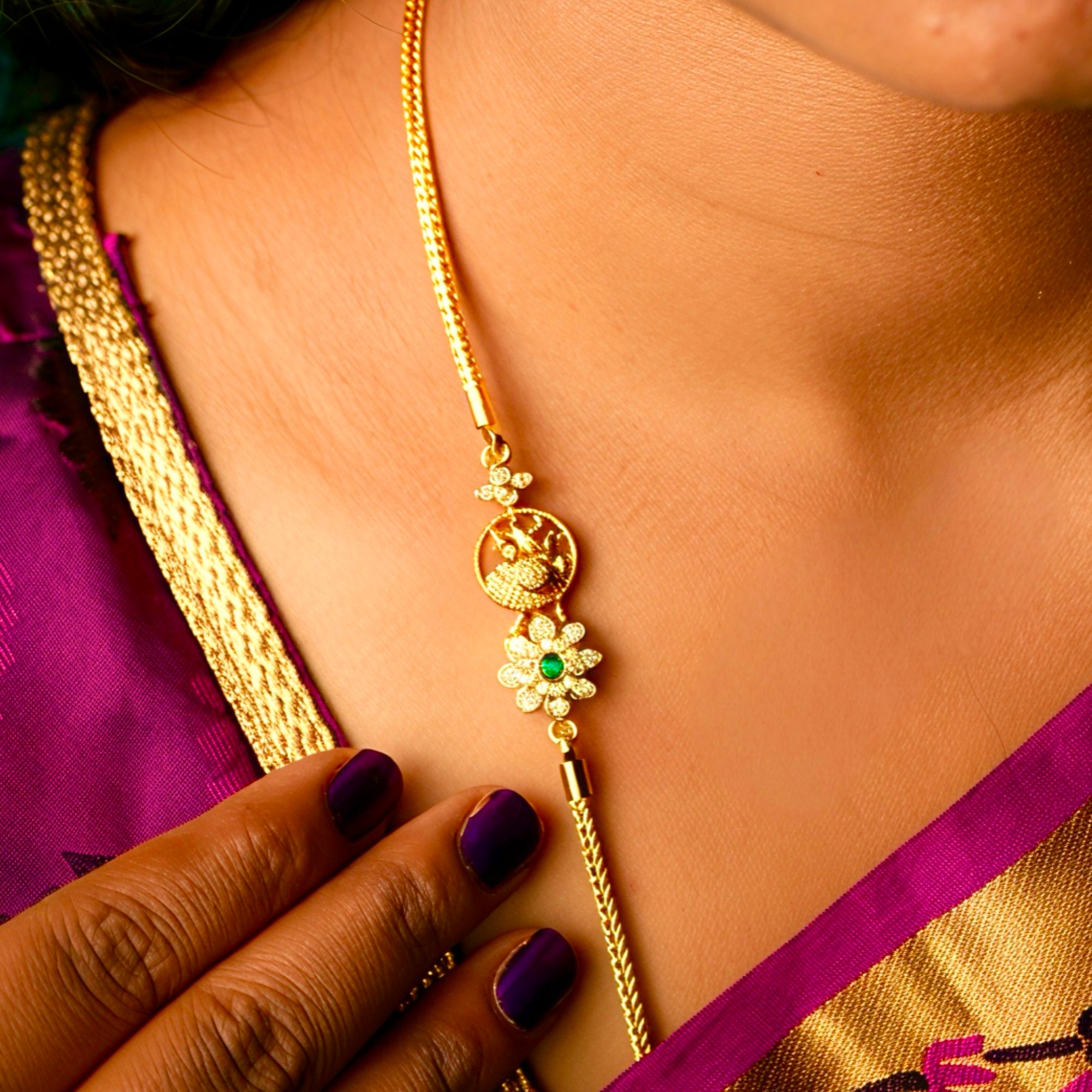 Celebrate traditional elegance with this 925 Silver Peacock Floral Pendant Chain, featuring a finely carved peacock motif paired with a CZ floral pendant and a vibrant green gemstone. Crafted in 92.5 sterling silver with premium gold polish, this skin-friendly and durable chain is perfect for daily wear, Thali use, and festive styling. A beautiful ethnic accessory that enhances sarees and traditional outfits with grace and charm.