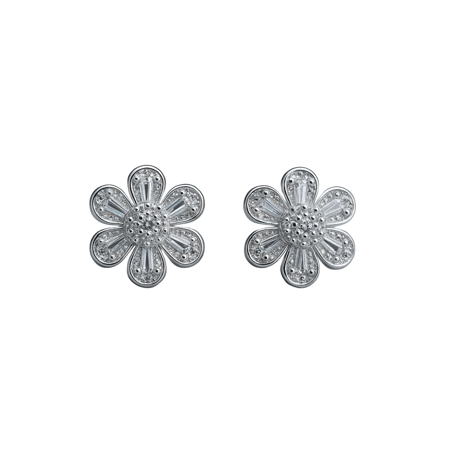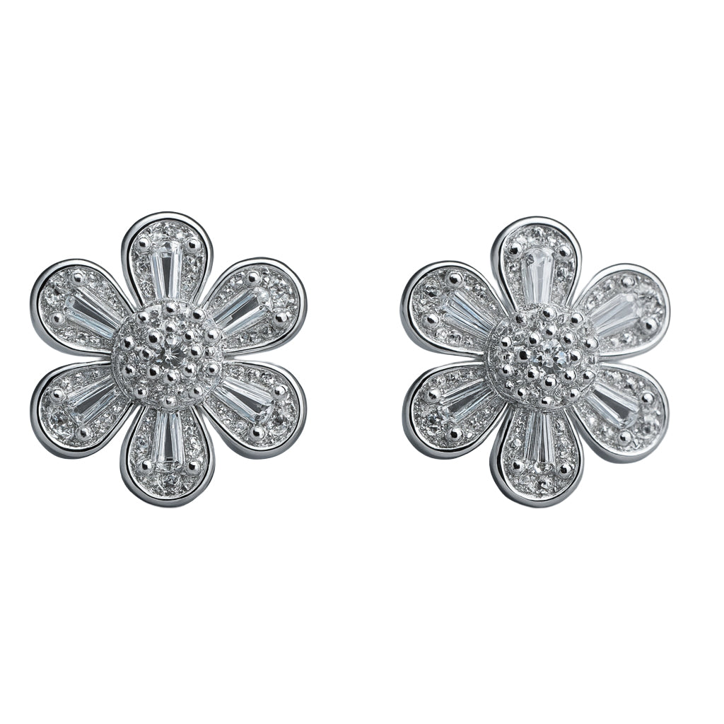 Bring a fresh bloom to your style with these 925 Sterling Silver Daisy Floral CZ Stud Earrings. Crafted in a radiant daisy design, each petal is lined with baguette-cut and micro CZ stones for a sparkling floral finish