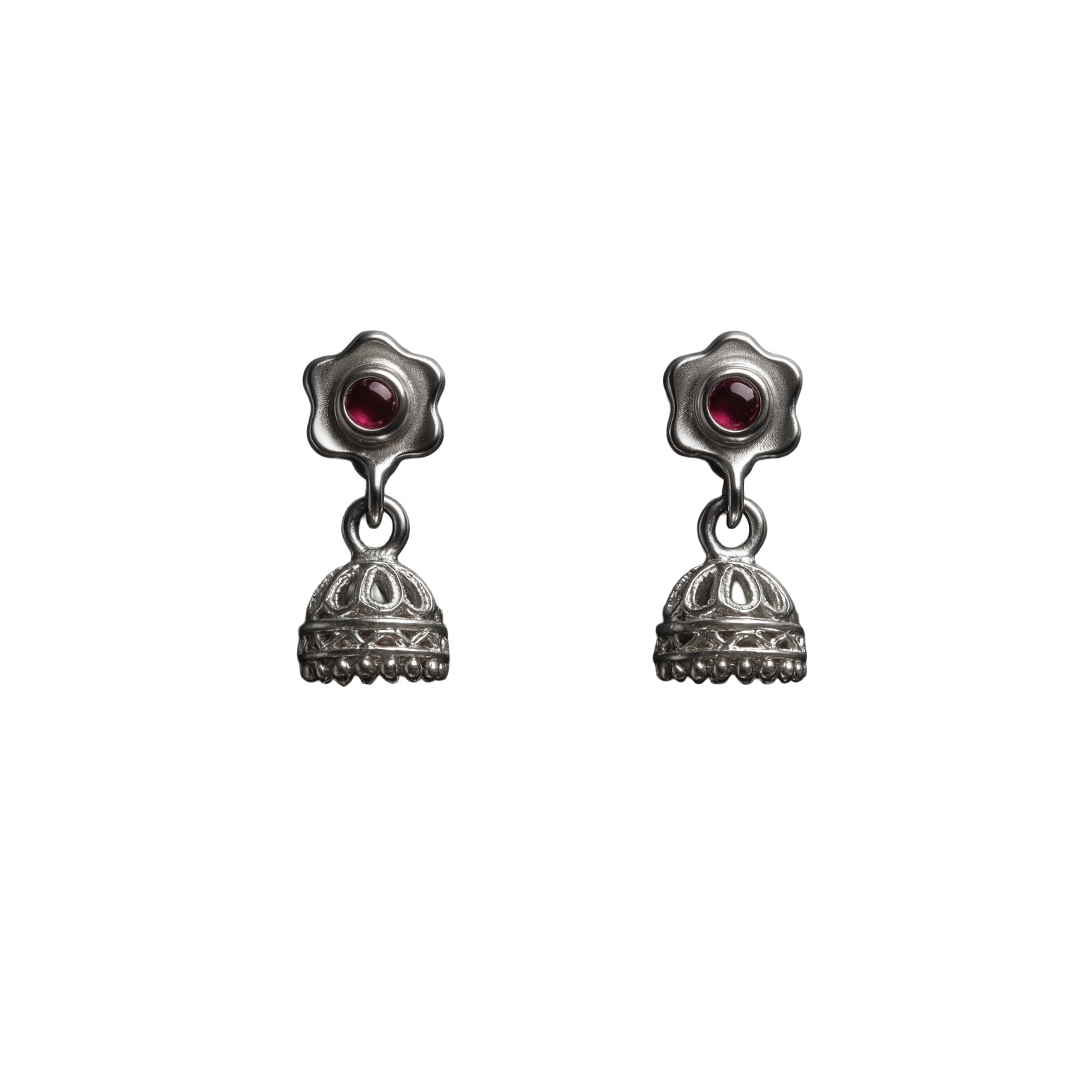 Traditional and timeless, these 925 Sterling Silver Red Stone Jhumka Earrings feature a delicate floral stud top with a red gemstone accent, paired with an ornate jhumka.