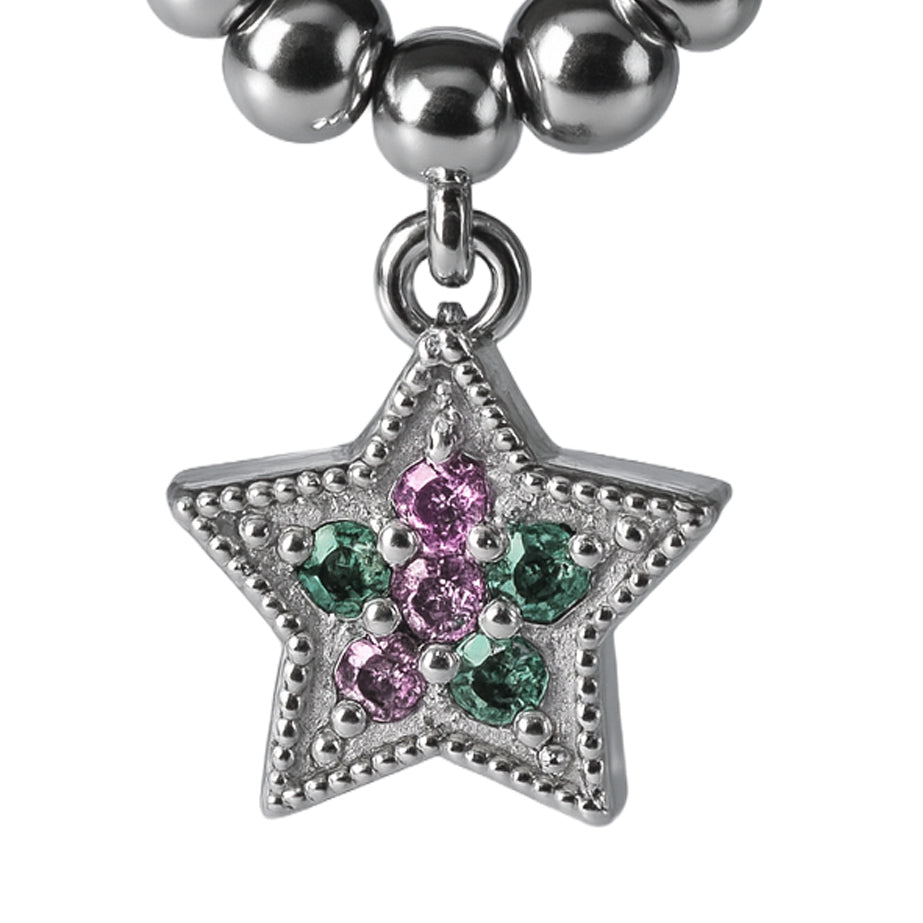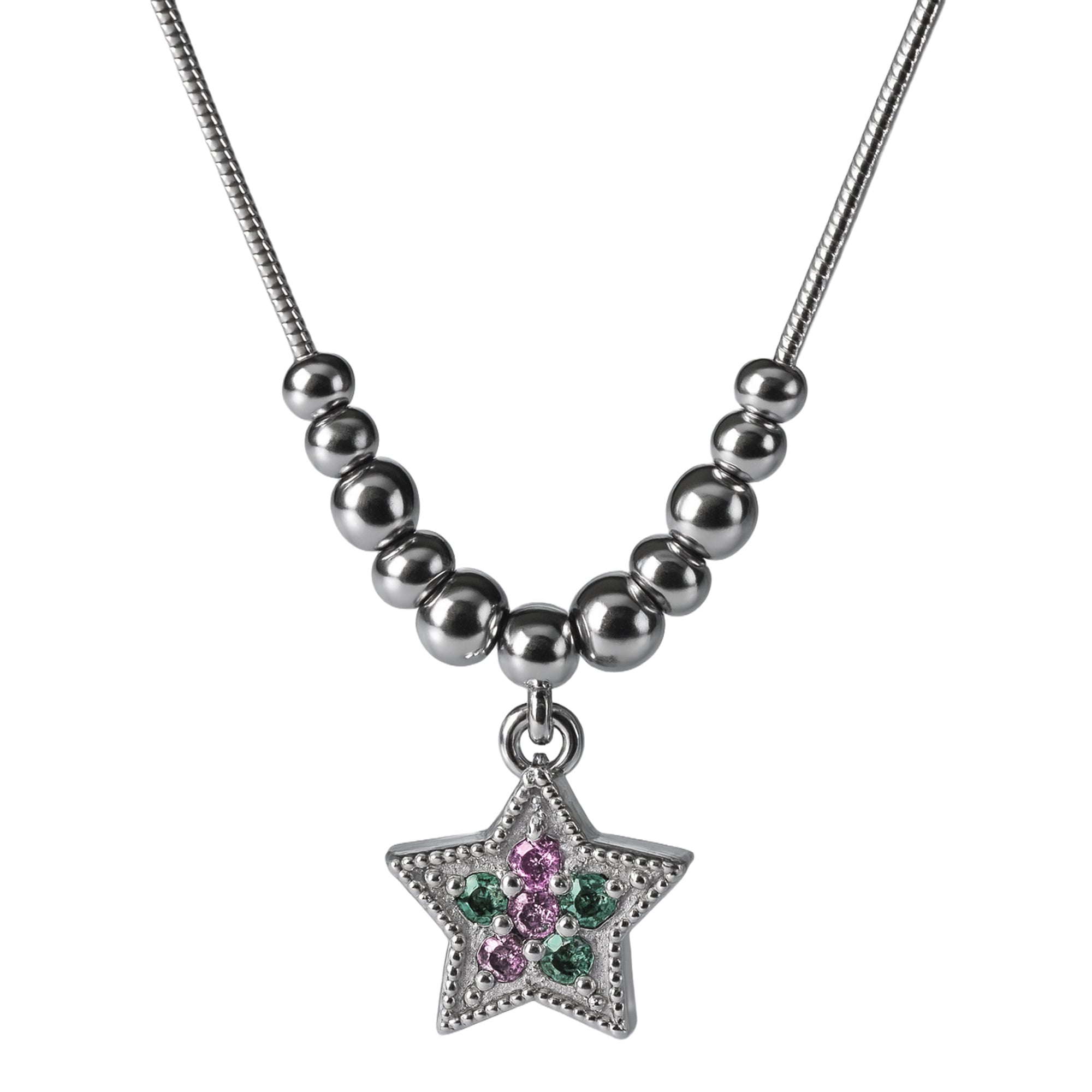 Shine bright with this enchanting 925 Sterling Silver necklace featuring a star-shaped pendant adorned with pink and green cubic zirconia accents. The polished beaded chain adds a modern touch, making it the perfect accessory to bring sparkle and charm to your everyday style.