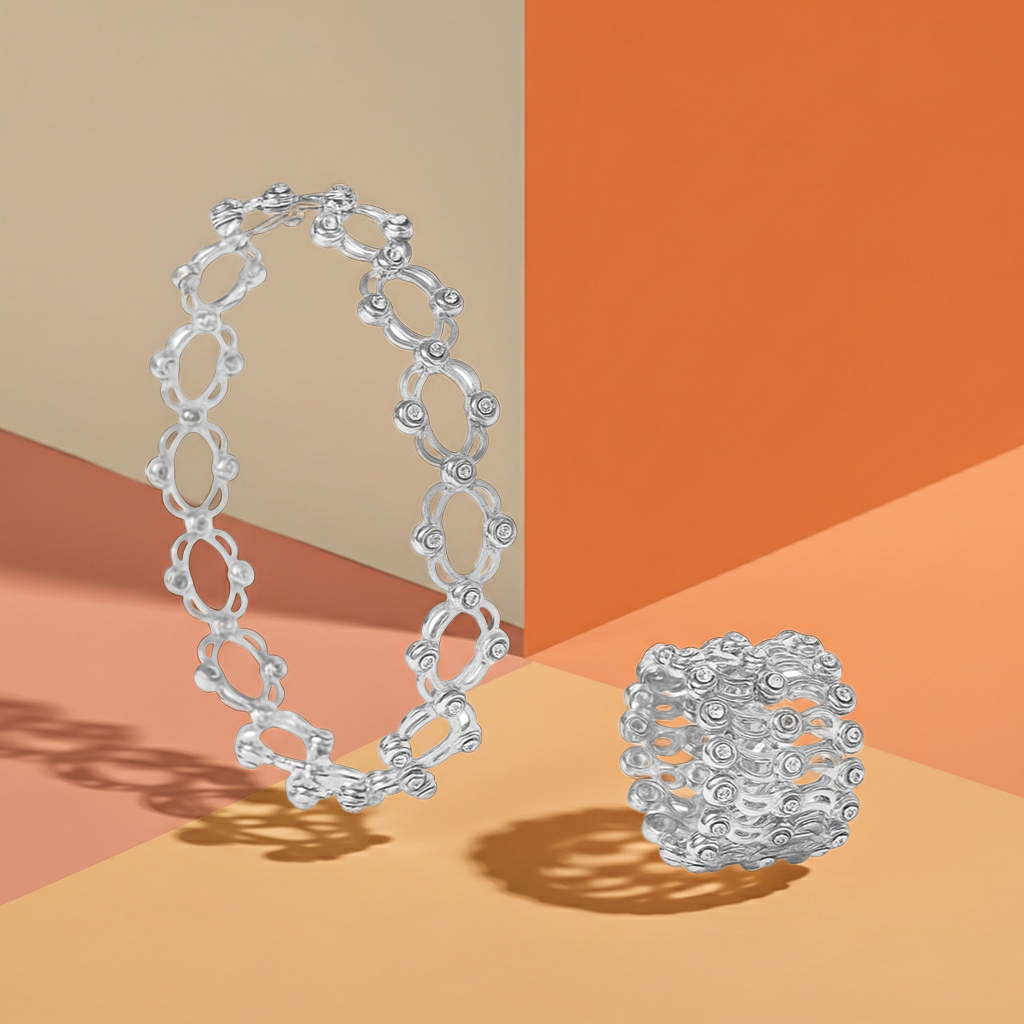 To maintain the natural shine of your silver jewellery, avoid contact with perfumes, lotions, and water. After wearing, gently clean your piece with a soft cloth and store it in a dry, airtight pouch to prevent tarnish.
