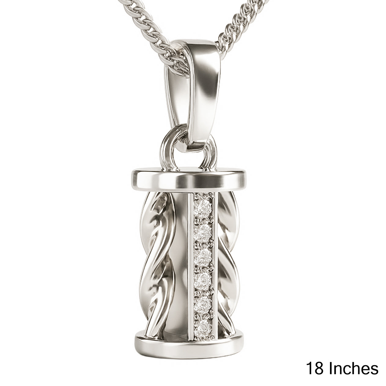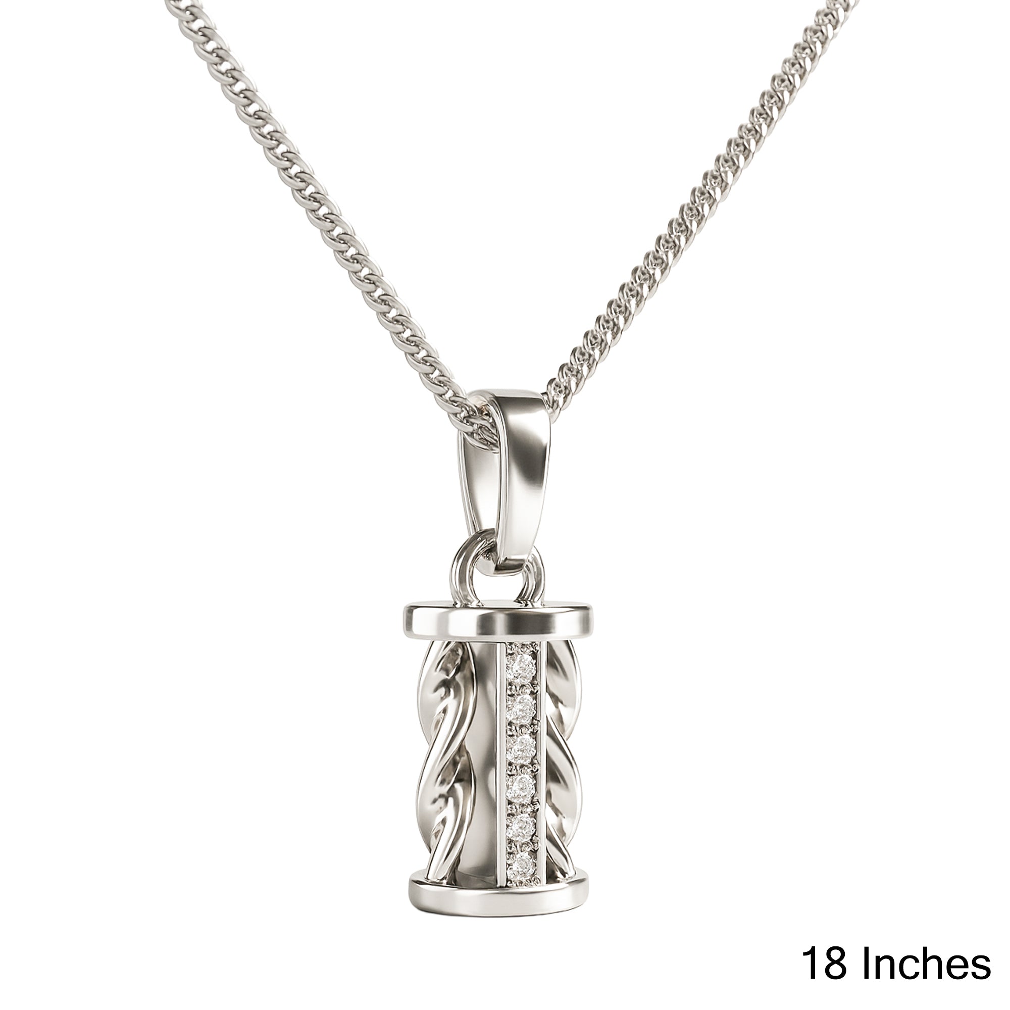 Make a statement with the 925 Sterling Silver Cylindrical Twist Pendant Necklace, crafted with a unique 3D cylindrical design. The pendant features a twisted rope-inspired structure accented with a vertical row of shimmering cubic zirconia, symbolizing strength and elegance. A modern choice for those who love distinctive jewelry with timeless charm.