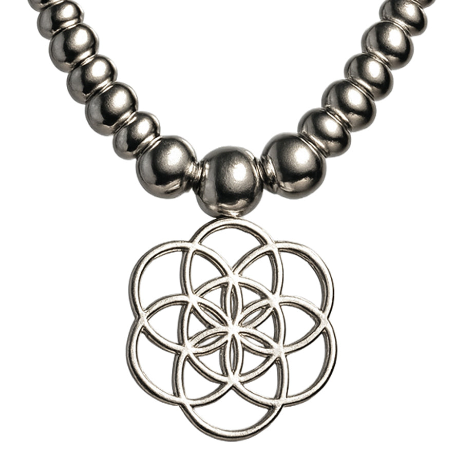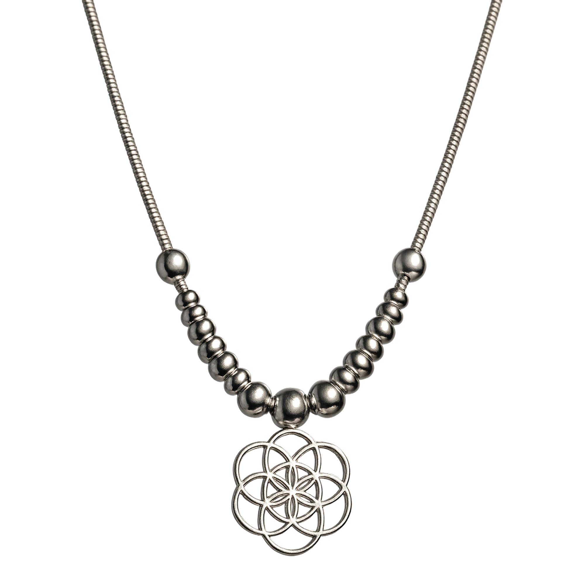 Elevate your everyday elegance with this 925 Sterling Silver necklace featuring a unique geometric floral pendant. The intricate openwork design symbolizes harmony and timeless beauty, while the polished silver finish adds a modern edge. Accented with beaded detailing along the chain, this piece brings a perfect mix of tradition and contemporary style.