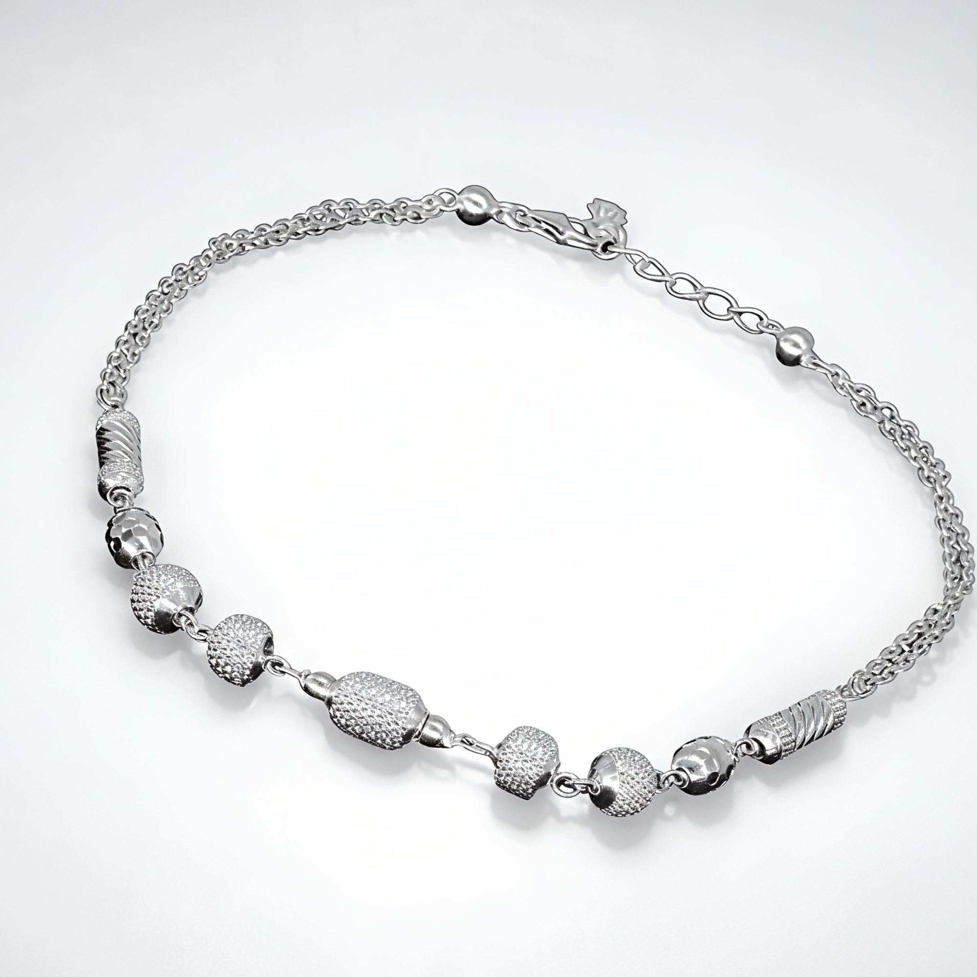 Designed for modern women who love understated luxury, each anklet features a delicate dual chain accented with finely textured silver beads that catch light with every movement.