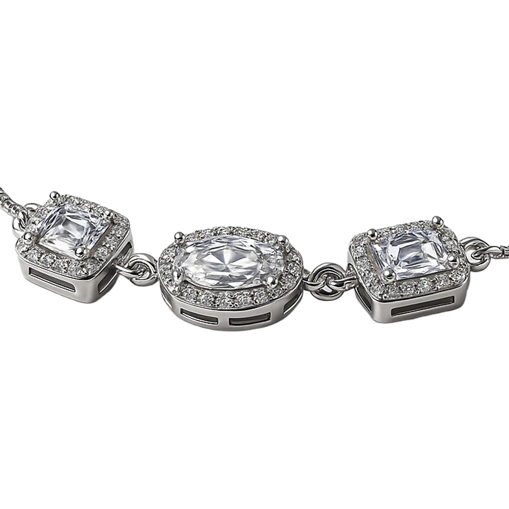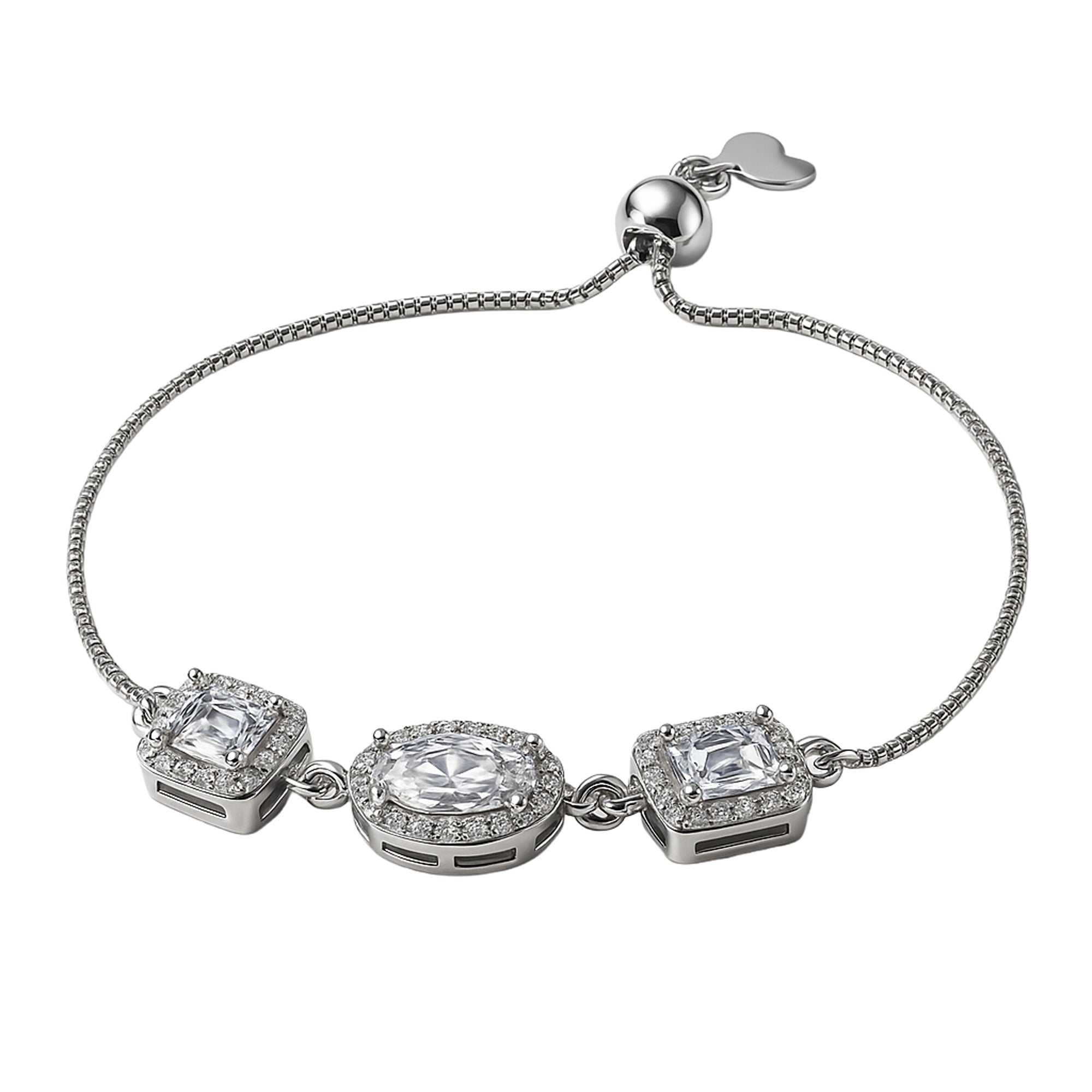 Elevate your elegance with this 925 Sterling Silver bracelet featuring three dazzling cubic zirconia stones, each haloed with sparkling accents. Designed with a sleek adjustable chain, it ensures a perfect and comfortable fit for every wrist. The timeless combination of brilliance and silver makes this bracelet an ideal piece for both everyday glamour and special occasions.