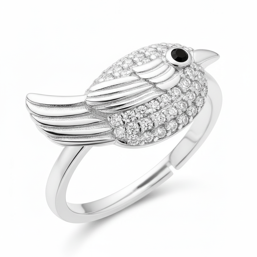 This elegant Silver Bird Design Ring features a beautifully sculpted bird motif embellished with sparkling CZ stones and a striking black stone eye. With its premium finish and adjustable fit, this unique ring adds a playful yet luxurious touch to everyday and special-occasion looks.