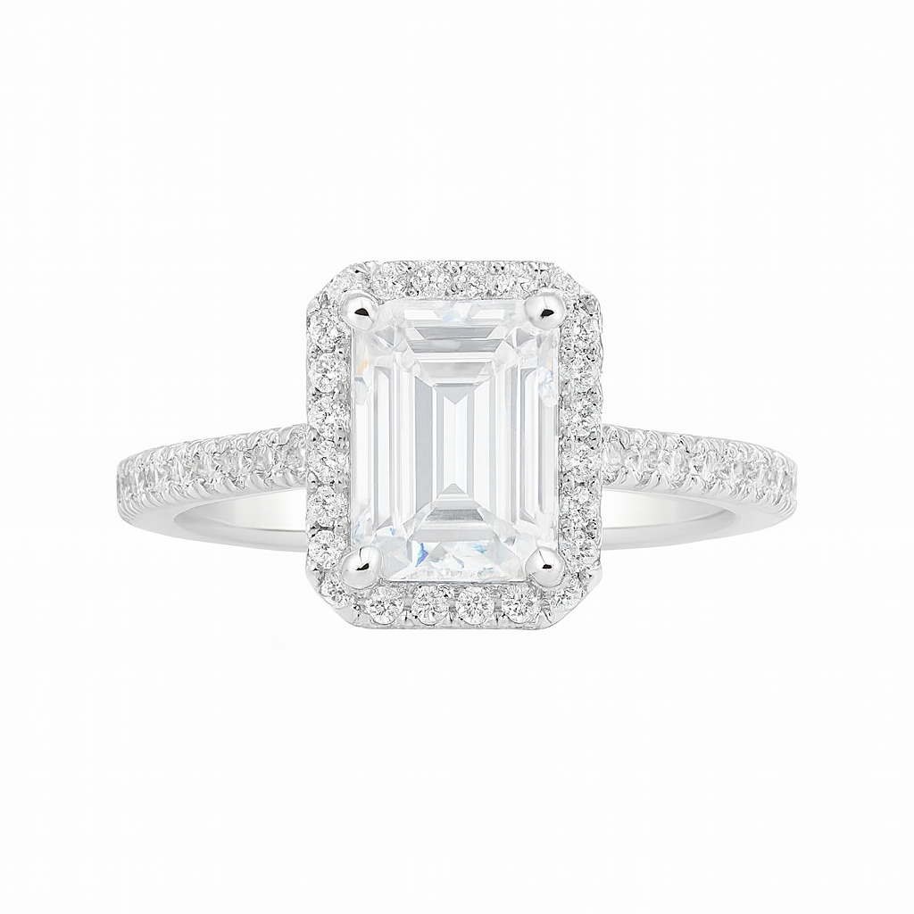 • Design: Emerald-cut solitaire centerpiece with a sparkling halo frame