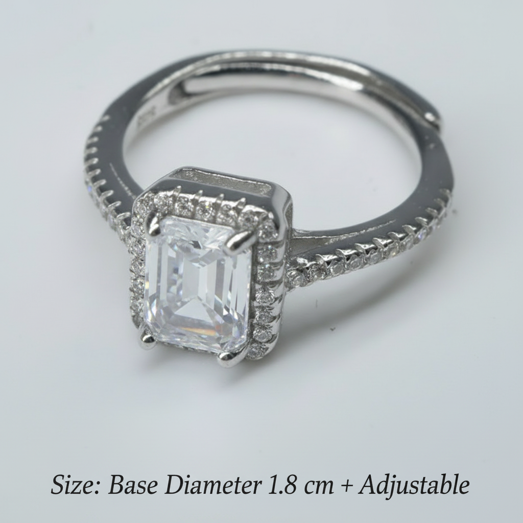 This stunning 925 Sterling Silver Adjustable Emerald-Cut Halo Ring features a dazzling emerald-cut CZ centerpiece surrounded by a radiant halo and a pave-set band for added brilliance. A refined, luxurious design perfect for special occasions, gifting, and everyday elegance.