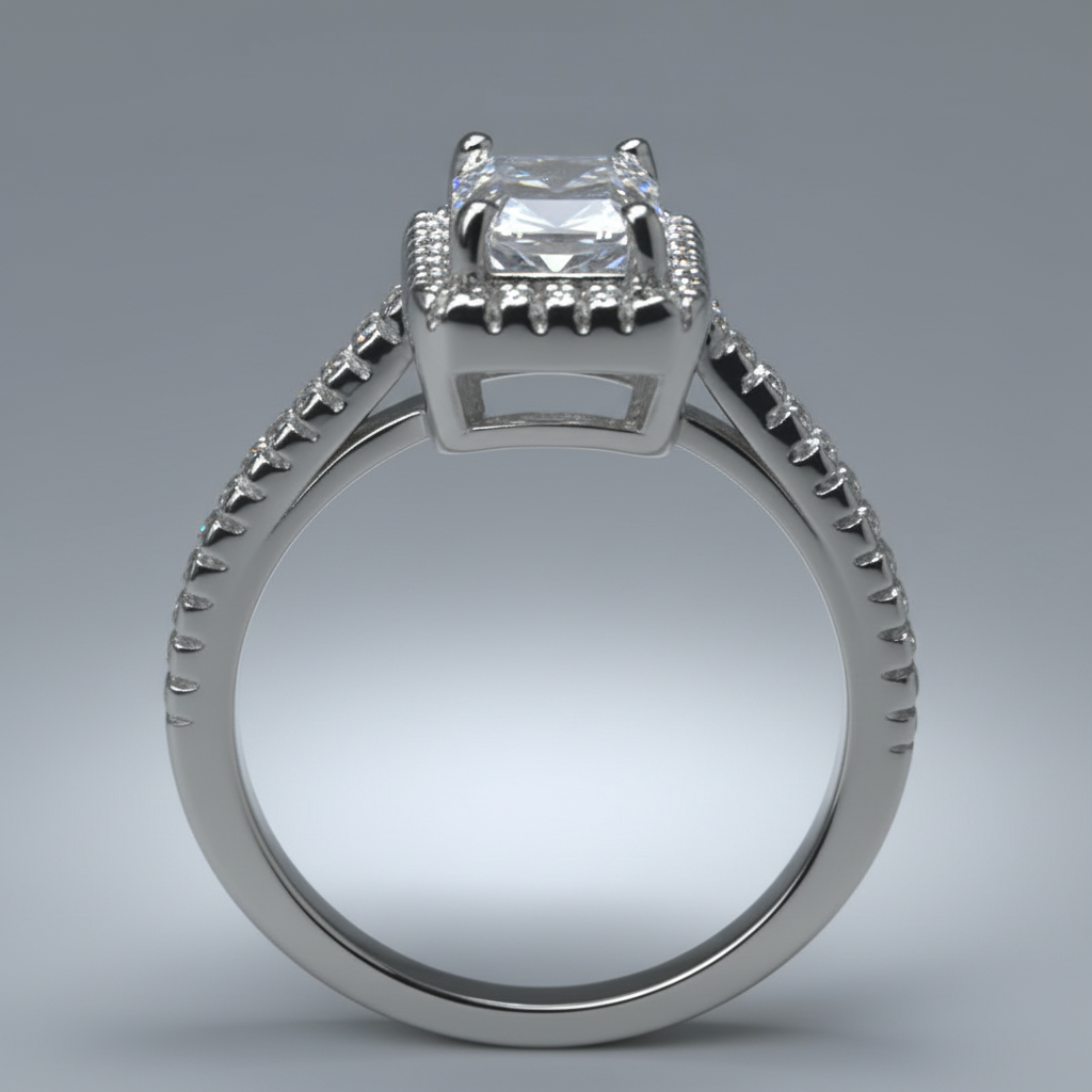 • Stones: Premium Emerald-Cut CZ center stone + halo CZ stones + pave CZ band accents