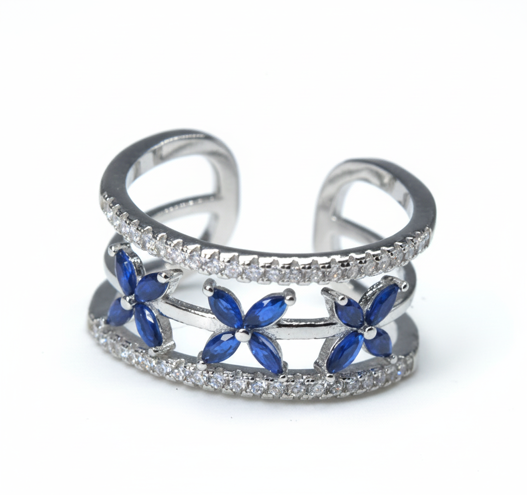 • Design: Dual-band open ring with marquise-cut blue CZ floral motifs