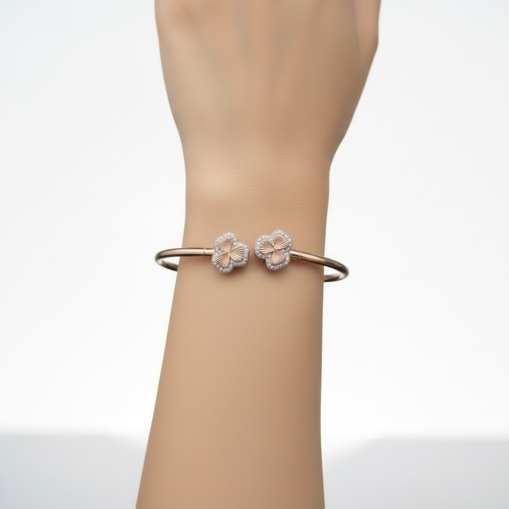Elevate your everyday sparkle with this elegant Rose Gold Clover Kada Bracelet, featuring dual textured floral motifs surrounded by micro-pave accents. Crafted in a premium polished finish, this adjustable open bangle adds a refined touch to any outfit—perfect for gifting or daily wear.