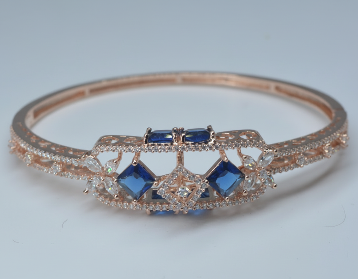 This elegant 925 Sterling Silver Rose Gold Blue Stone Kada Bracelet features dazzling sapphire-tone stones, floral CZ accents, and a beautifully detailed designer frame. With a 6 cm diameter and premium rose-gold finish, it’s a luxurious statement piece for festive and special occasions.